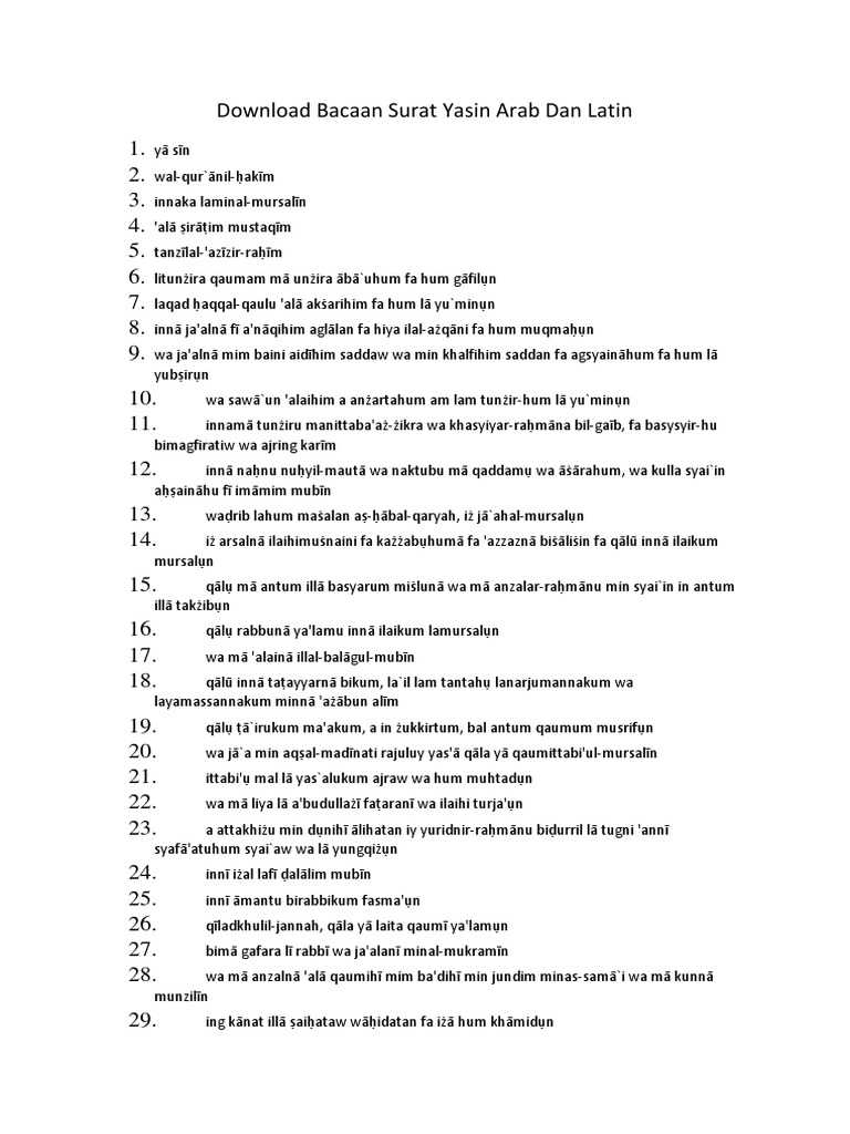 Bacaan surat yasin lengkap dan terjemahannya. سورة يس هى سورة مكية عدد آياتها 83 و ترتيبها فى المصحف السورة 36 و عدد الكلمات 733 و عدد حروفها 2988. Ibnu katsir paling banyak menjabarkan keutamaan surat yasin dalam tafsir al qur'anil adhim. Read surat yasin from the story surat yasin (lengkap) by nnadasyh (nad) with 56,394 reads (surat yasin, al baqarah, ayat kursi, al kahfi, dan ar rahman lengkap {latin dan terjemahannya}. Maksudnya, surat tersebut diturunkan saat periode sebelum hijrah.